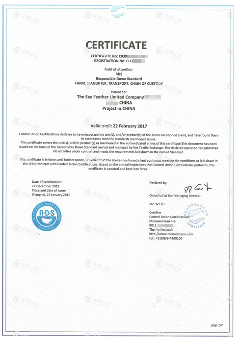 恭贺大连XX服装有限公司2024年2月顺利通过RDS认证