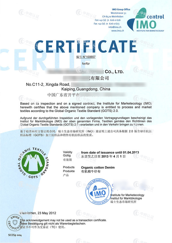 GOTS认证的内容:认证产品的原料、生产过程、包装和运输、投入物(包括辅料、染化料、加工助剂等)、生产记录、社会准则、环境管理、质量控制(包括技术质量参数和残留物的检测)等内容
