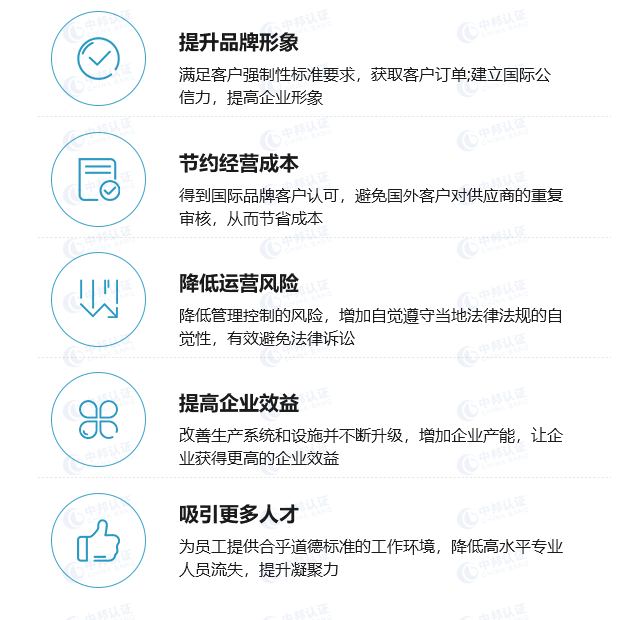 中邦一贯秉承“贡献专业价值,助力客户成长”的服务理念,凭借完善的服务网络、专业高效的服务队伍、标准化的服务流程及各项创新与服务,长期致力于帮助客户应对质量、环境、健康、安全、资源、社会责任及可持续发展等方面不断增加的挑战。注重服务效果及客户满意度,帮助企业优化流程、提高质量、破除贸易壁垒、赢得全球市场!